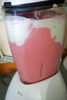 Dump the quart of yogurt into a 7-cup blender. It is important to put the yogurt in BEFORE the fruit in order for the blender to be able to work properly.
