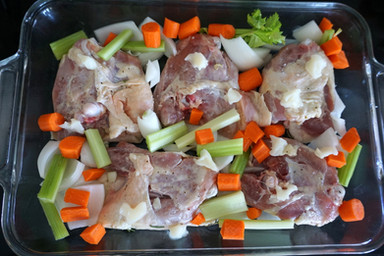 Place small dabs of duck fat on the chicken thigh and veggies.