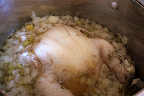 Add the whole chicken, 3Tb salt, and bay leaves to the pot. The chicken should be breast-side up and nestled down into the water.